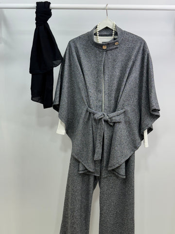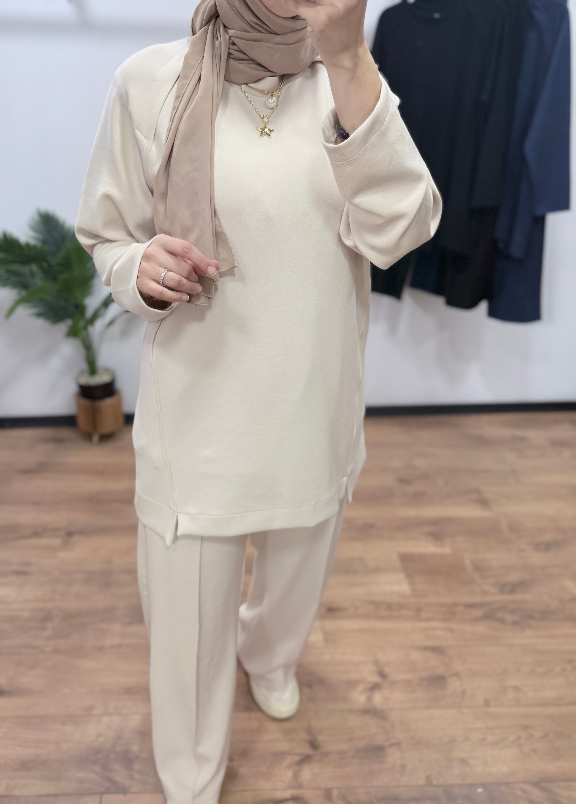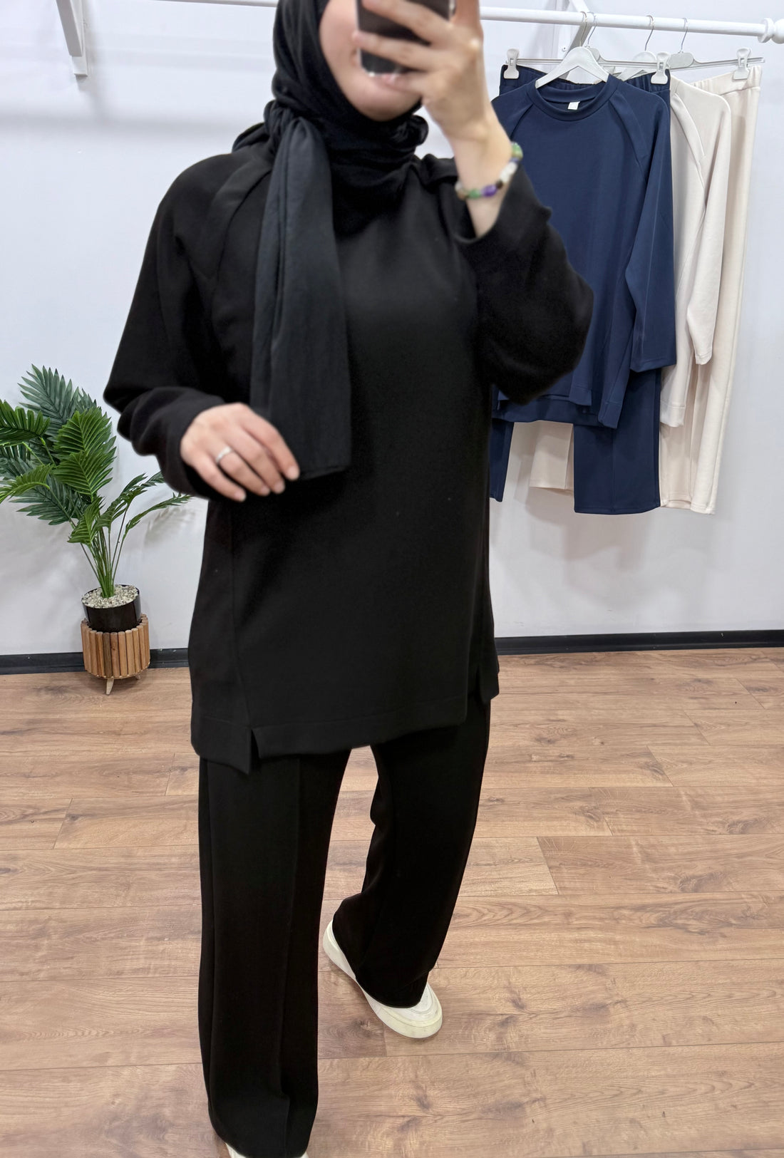 Şıklık ve konforu bir arada sunan bu üçlü takım; kapüşonlu üst, rahat kesim pantolon ve...