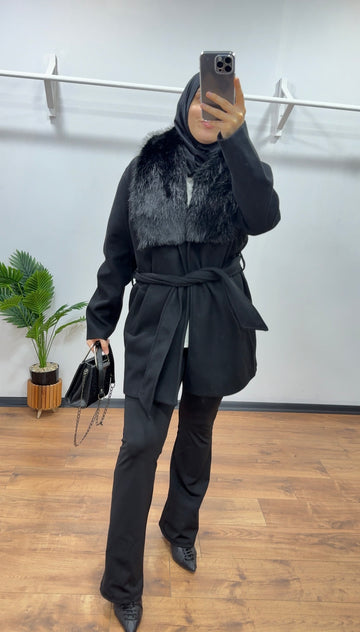 Siyah kürk yakalı kaban,modern silüeti ve lüks dokusuyla kış stiline zamansız bir şıklık kazandırır.Yumuşak kürk...