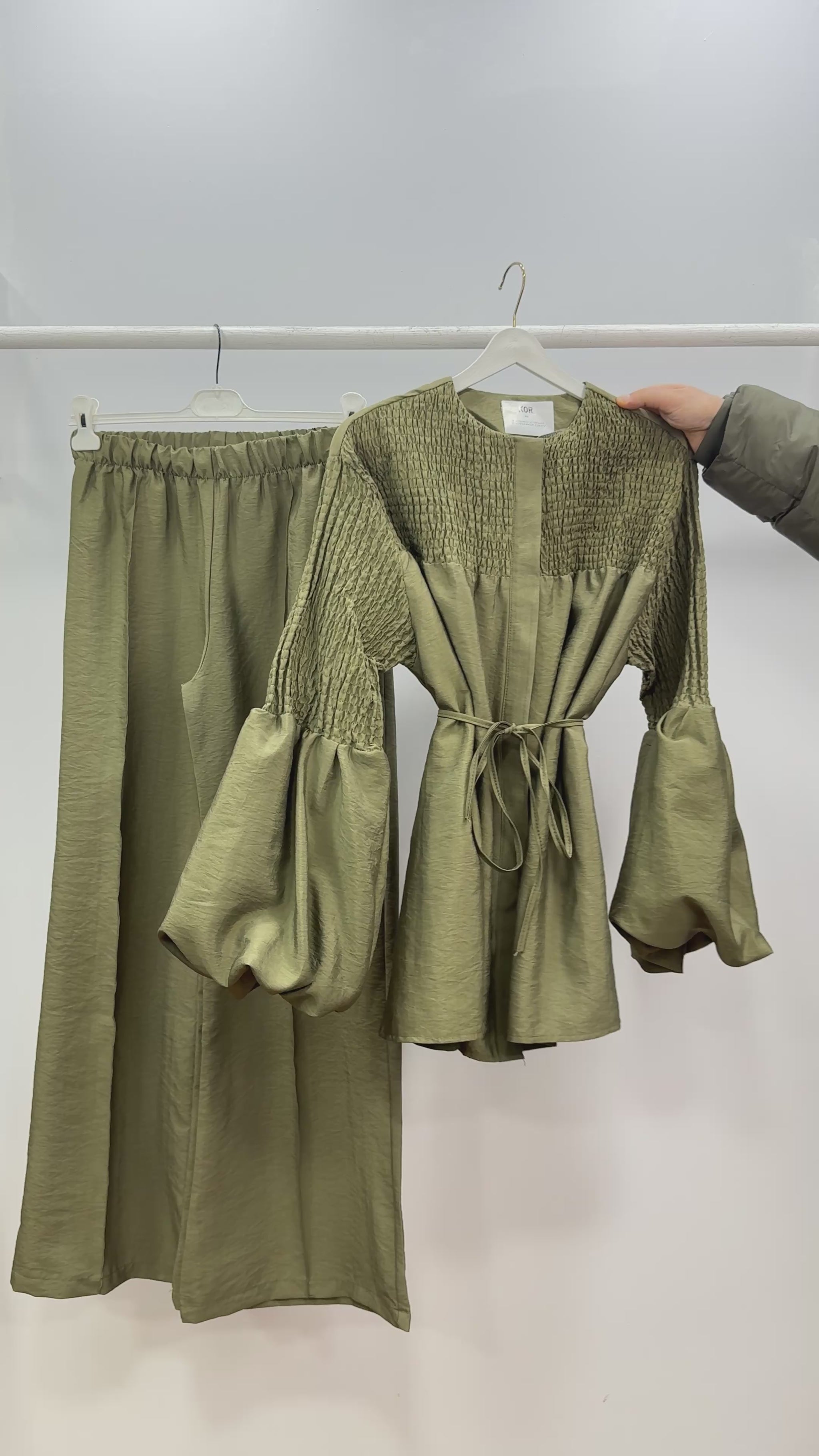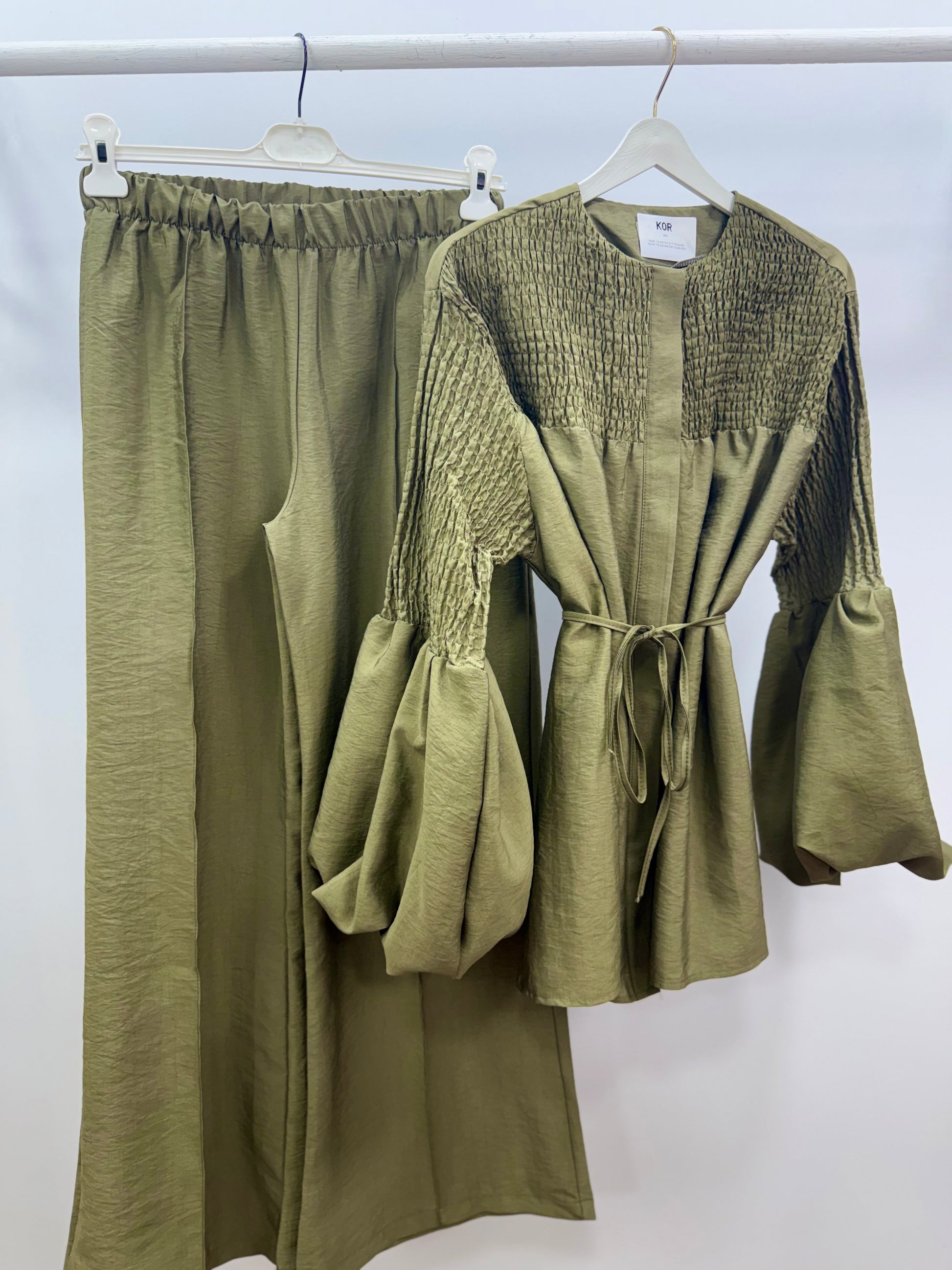 Balon Kol Takım cupra kumaştır.Hafif ve dökümlü yapısıyla hem konforlu hem şık bir kullanım sunar. Üst parçada yer alan balon kol tasarım modern bir siluet oluştururken, beli lastikli pantolon gün boyu rahat hareket imkânı sağlar.