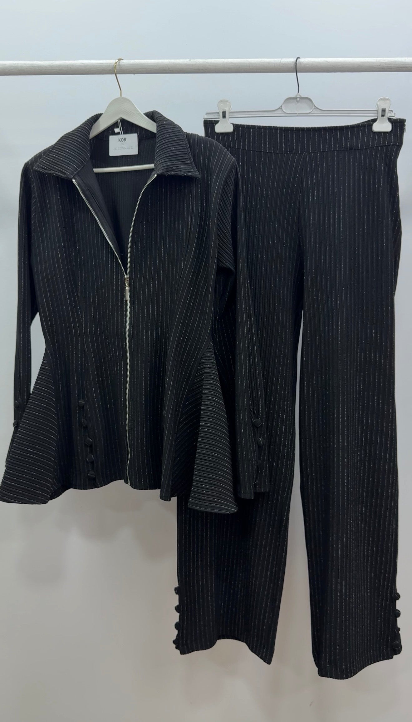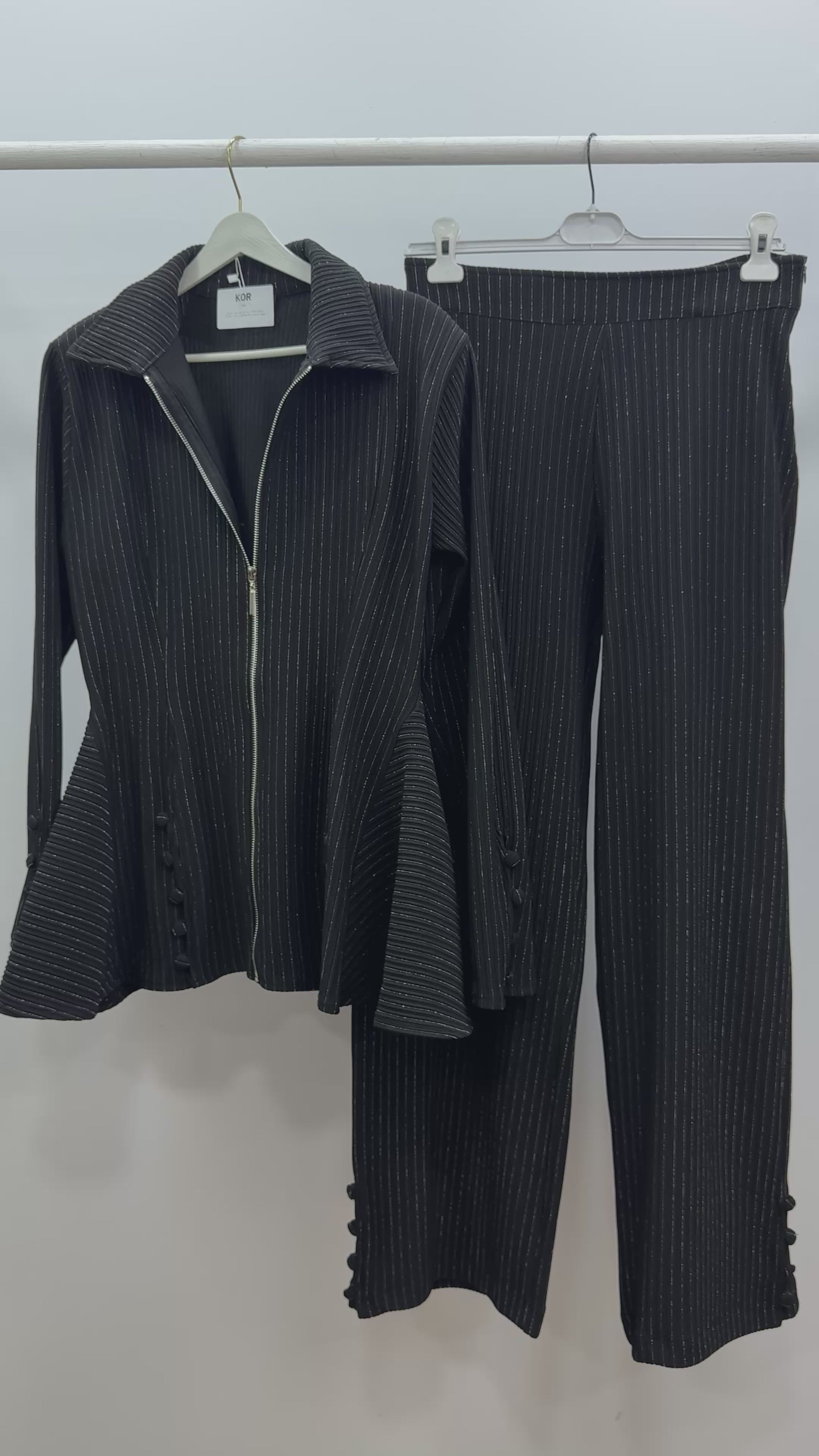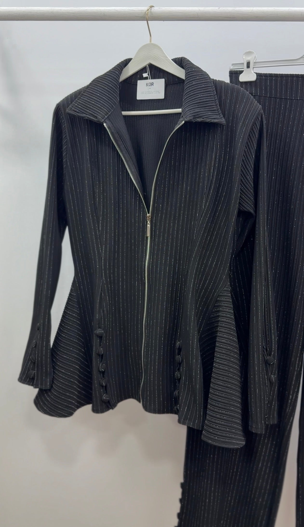 Modern düğme detaylı takım fermuarlı ceket ve rahat kesim pantolondan oluşan şık ikili takım hem günlük hem özel kullanıma uygundur.