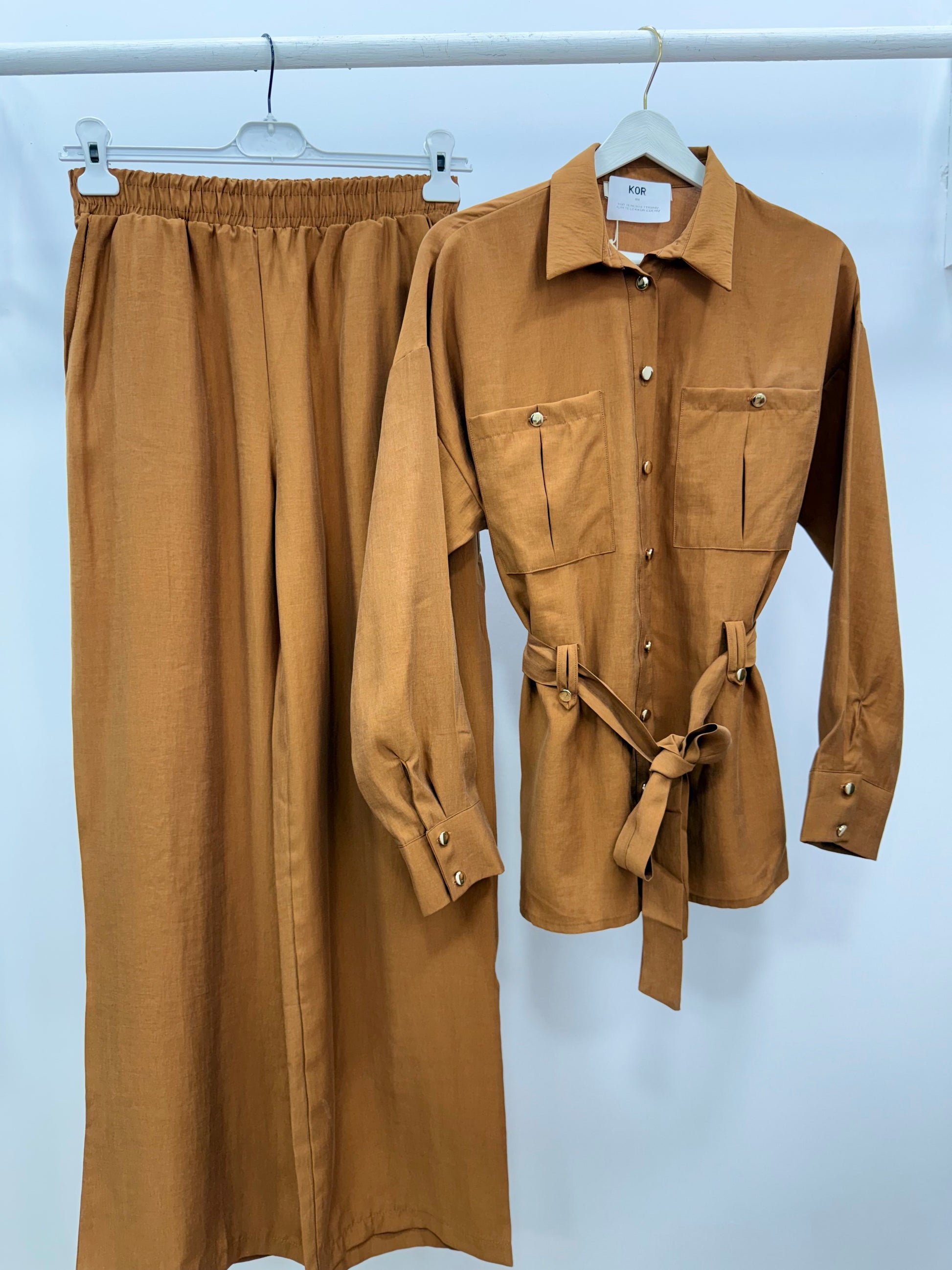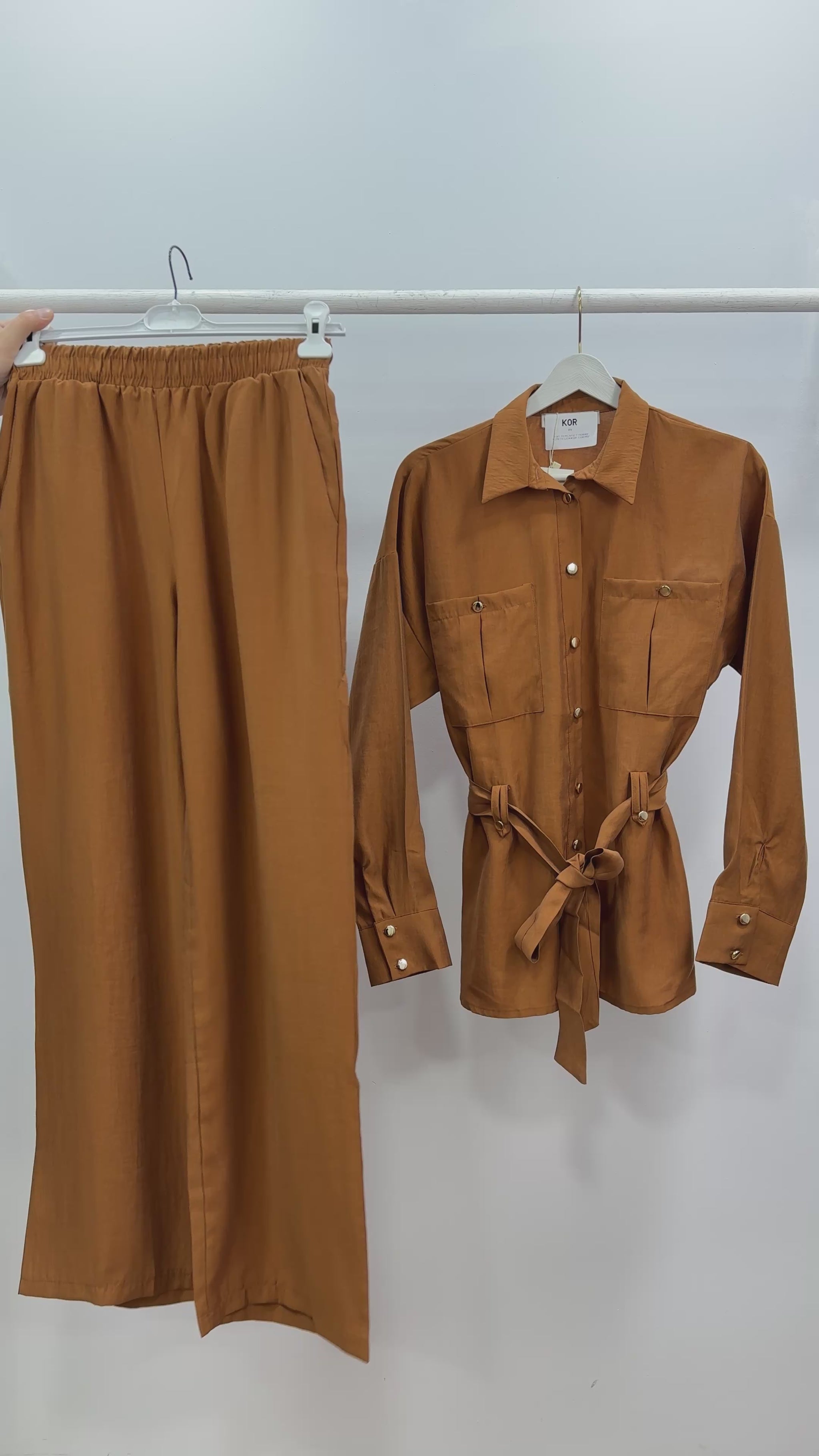 Hafif ve nefes alan kumaşıyla tasarlanan gömlek pantolon takım; hem günlük kombinlerde hem de özel günlerde zahmetsiz şıklık sunar.Beli lastikli, rahat kesim pantolonu gün boyu konfor sağlarken; düğme detaylı, cepli ve kuşaklı gömlek modeli feminen ve zarif bir siluet oluşturur.Basic ve bohem şıklığı bir arada isteyenler için tasarlandı.