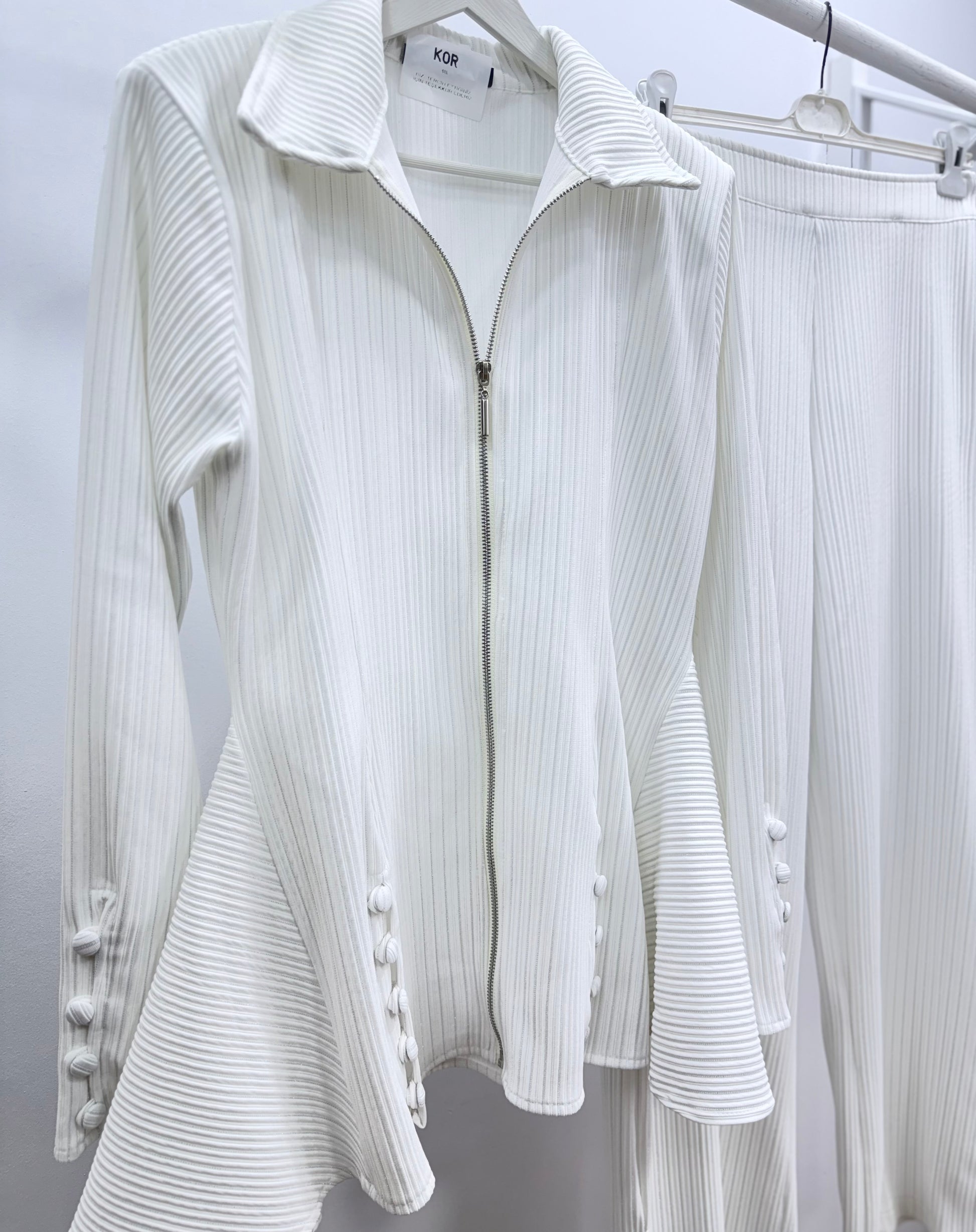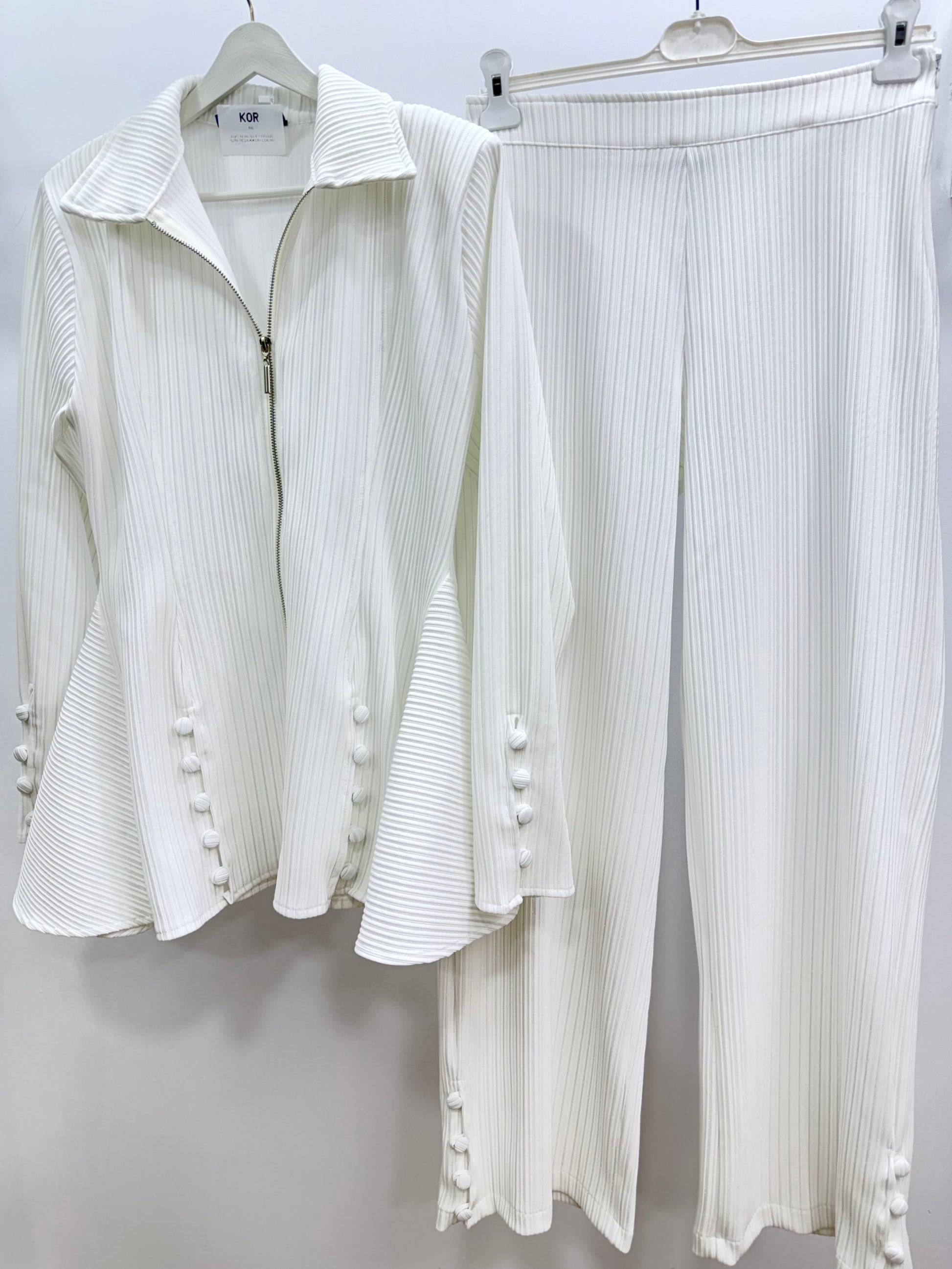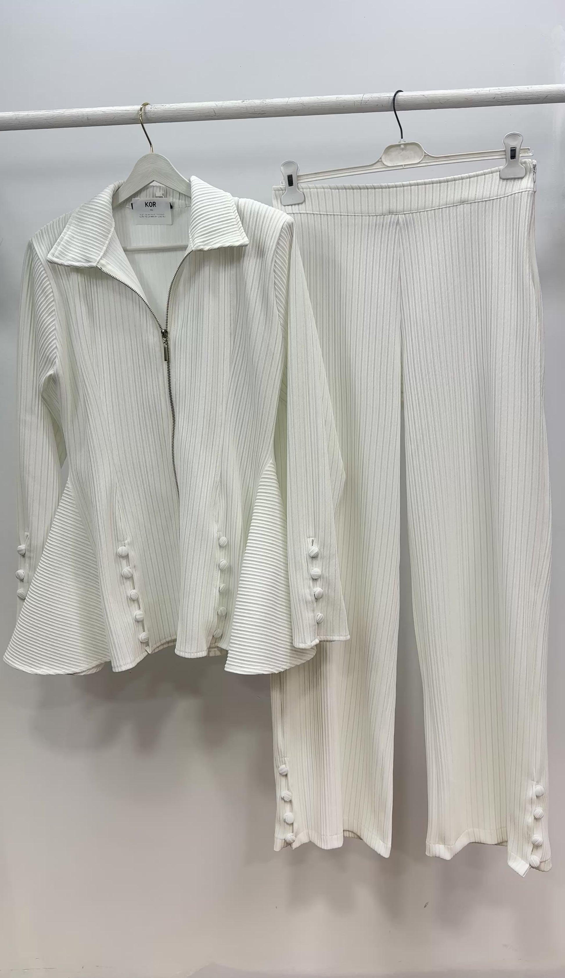 Modern düğme detaylı takım fermuarlı ceket ve rahat kesim pantolondan oluşan şık ikili takım hem günlük hem özel kullanıma uygundur.