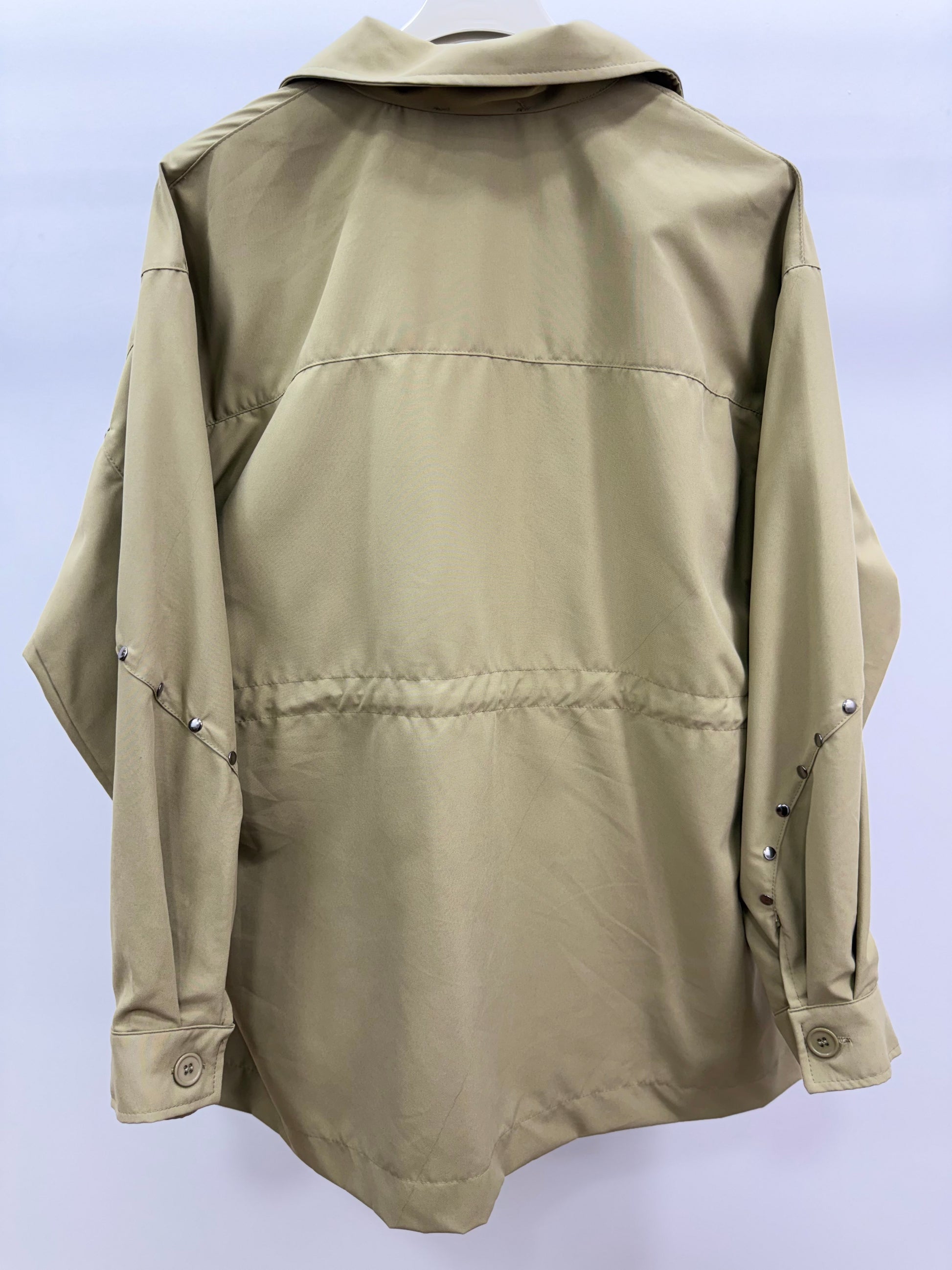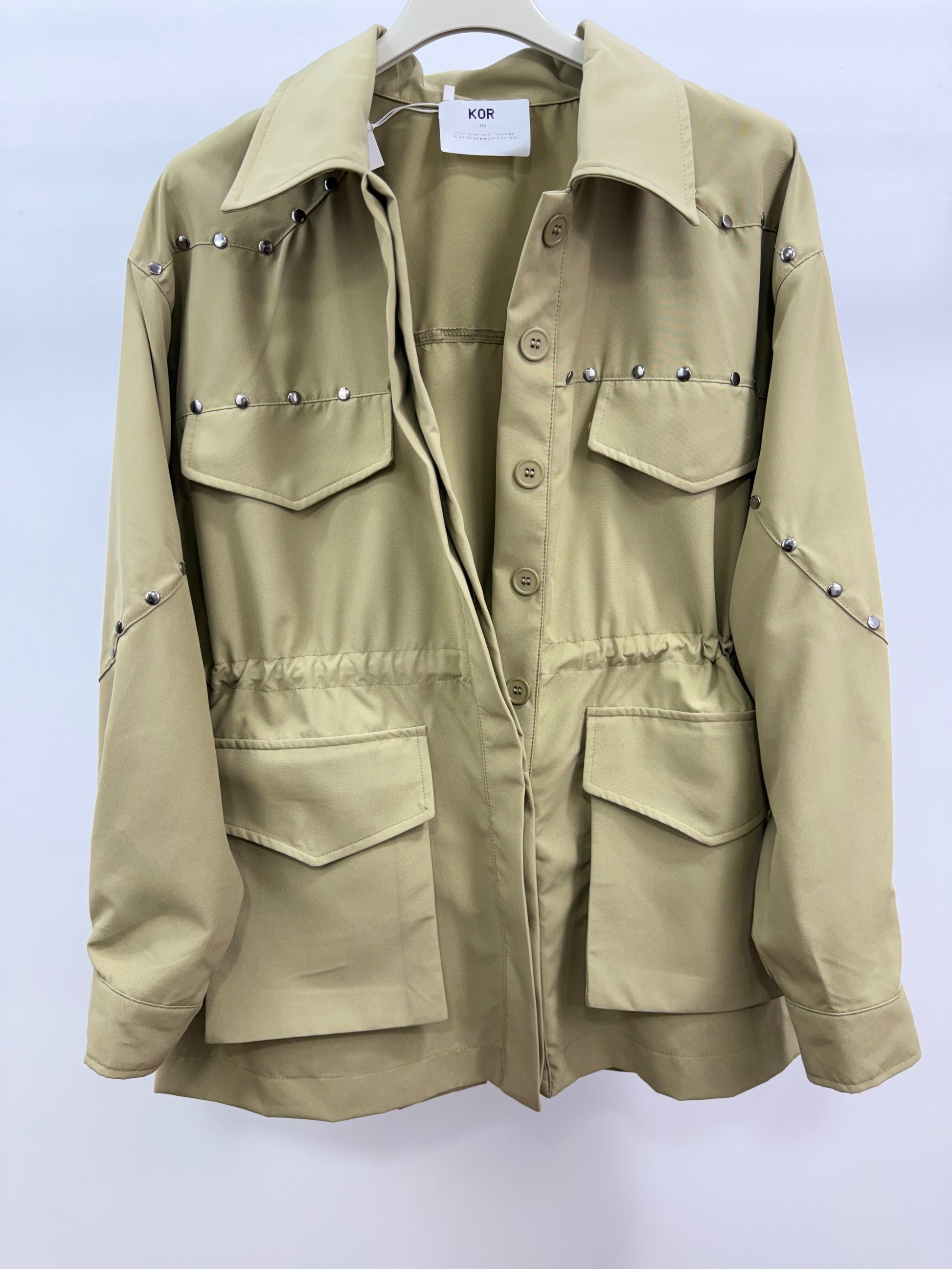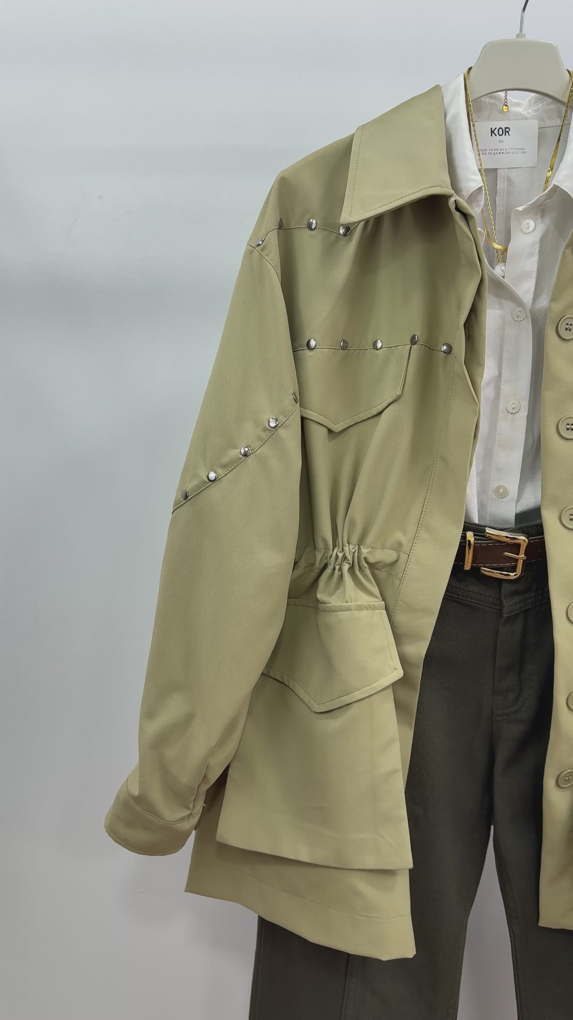 Kor Stil işlemeli ceket metal aksesuar detayları,cep tasarımı ve belden ayarlanabilir formu sayesinde hem günlük kombinlerde hem şık kombinlerde rahatlıkla tercih edilebilir. Mevsim geçişlerinde kurtarıcı parça olan bu açık haki ceket; rahat kalıbı ve zamansız tasarımıyla dolabınızın vazgeçilmezi olacak.
