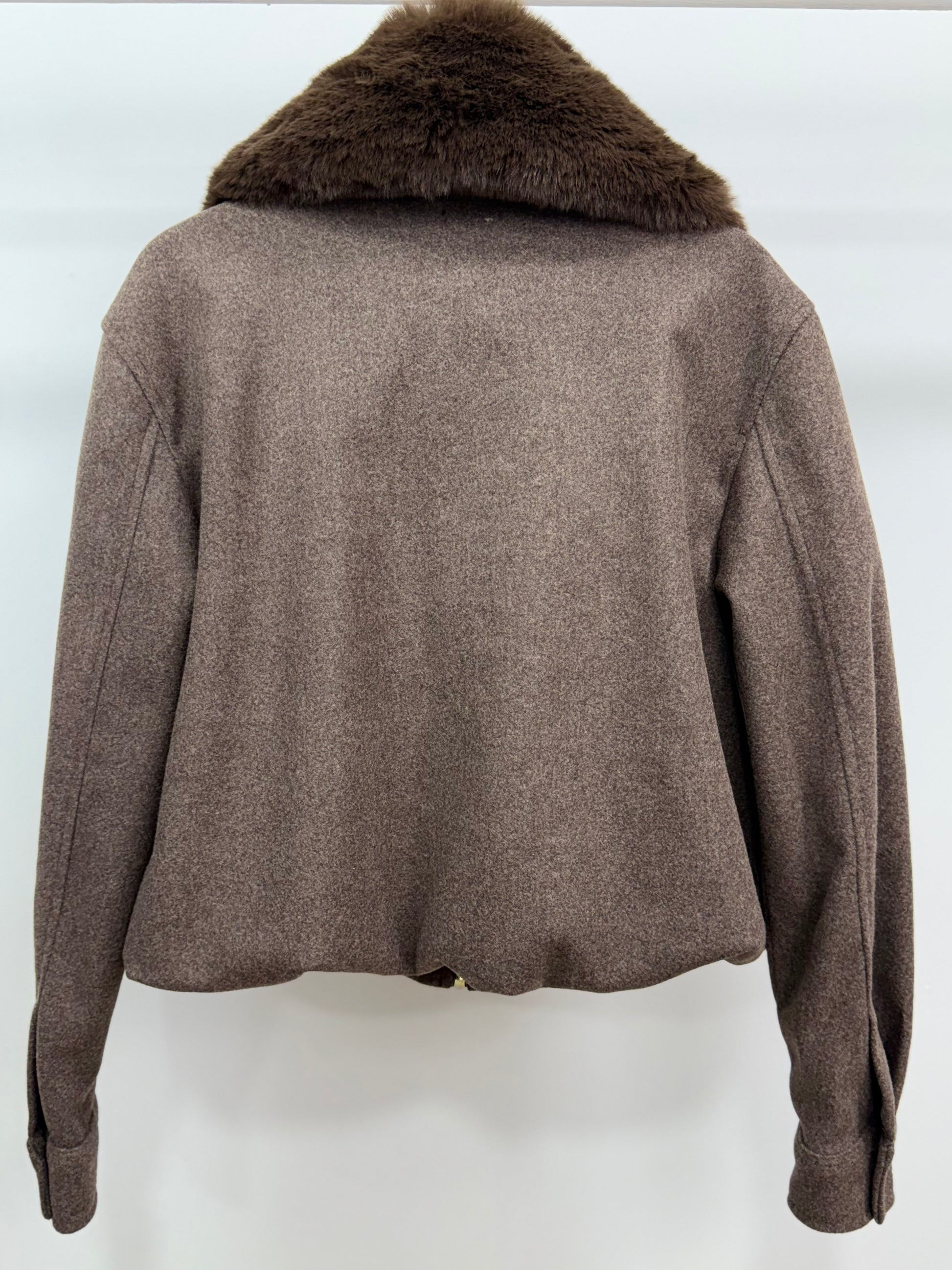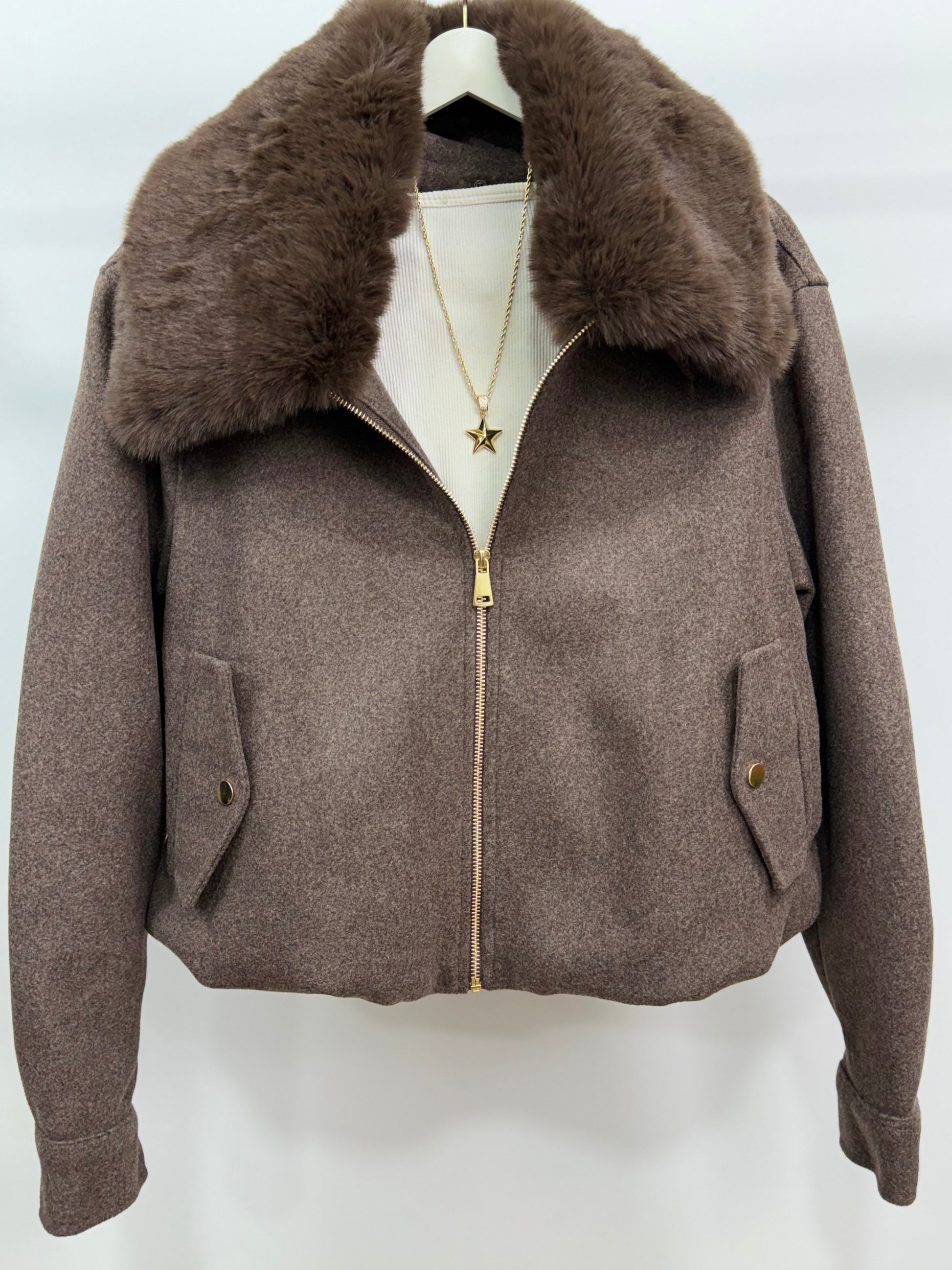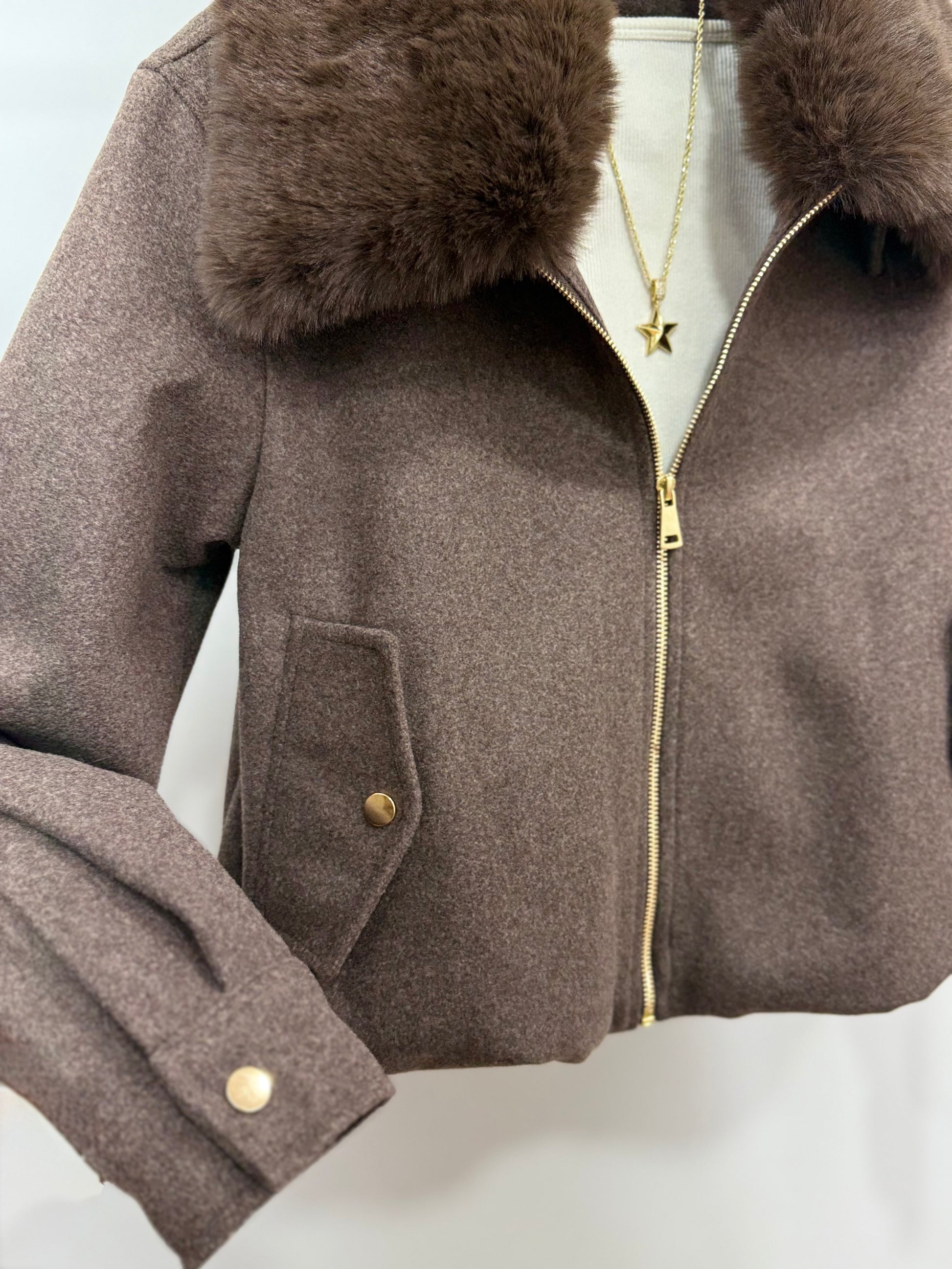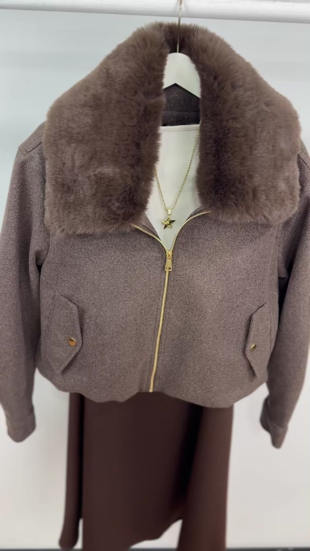 Şıklık ve fonksiyonelliği bir araya getiren kürk yakalı ceket, fermuarlı yapısı ve iç astarıyla soğuk havalarda konforlu kullanım sunar.
