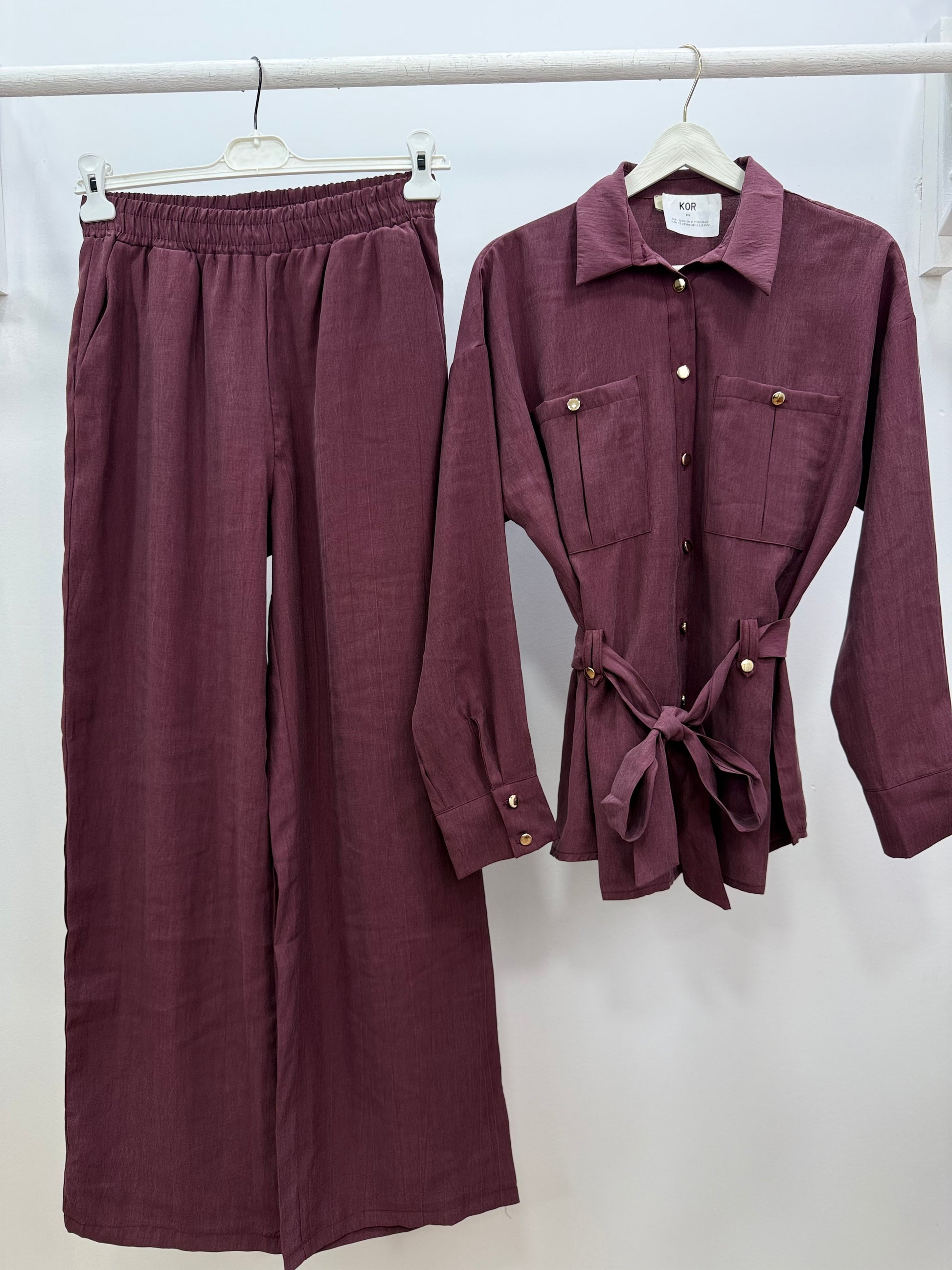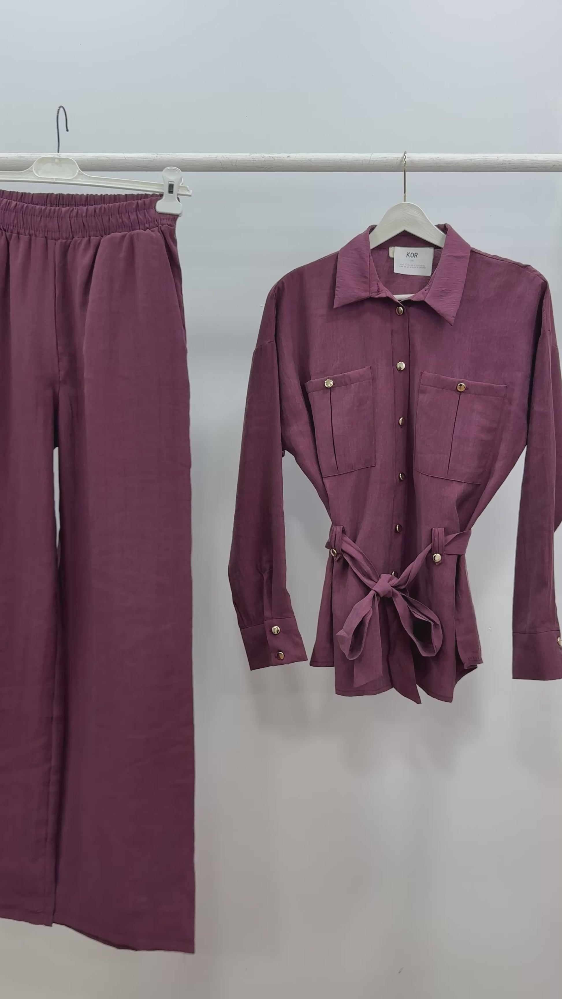 Hafif ve nefes alan kumaşıyla tasarlanan mürdüm gömlek pantolon takım; hem günlük kombinlerde hem de özel günlerde zahmetsiz şıklık sunar.Beli lastikli, rahat kesim pantolonu gün boyu konfor sağlarken; düğme detaylı, cepli ve kuşaklı gömlek modeli feminen ve zarif bir siluet oluşturur.Basic ve bohem şıklığı bir arada isteyenler için tasarlandı.