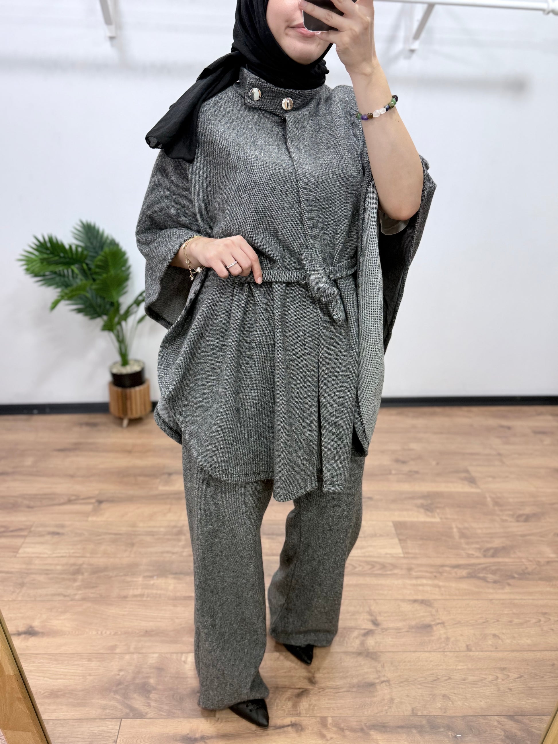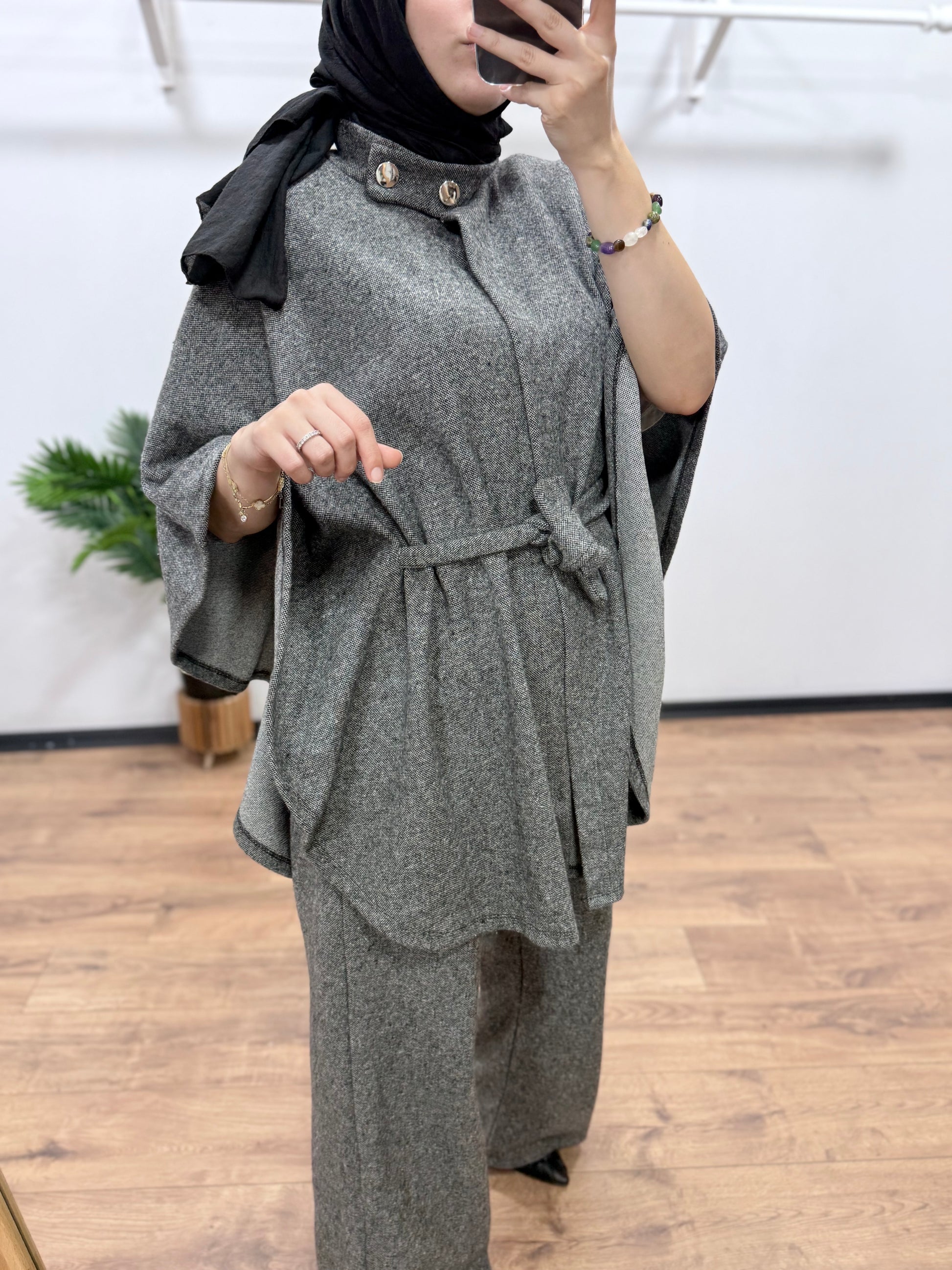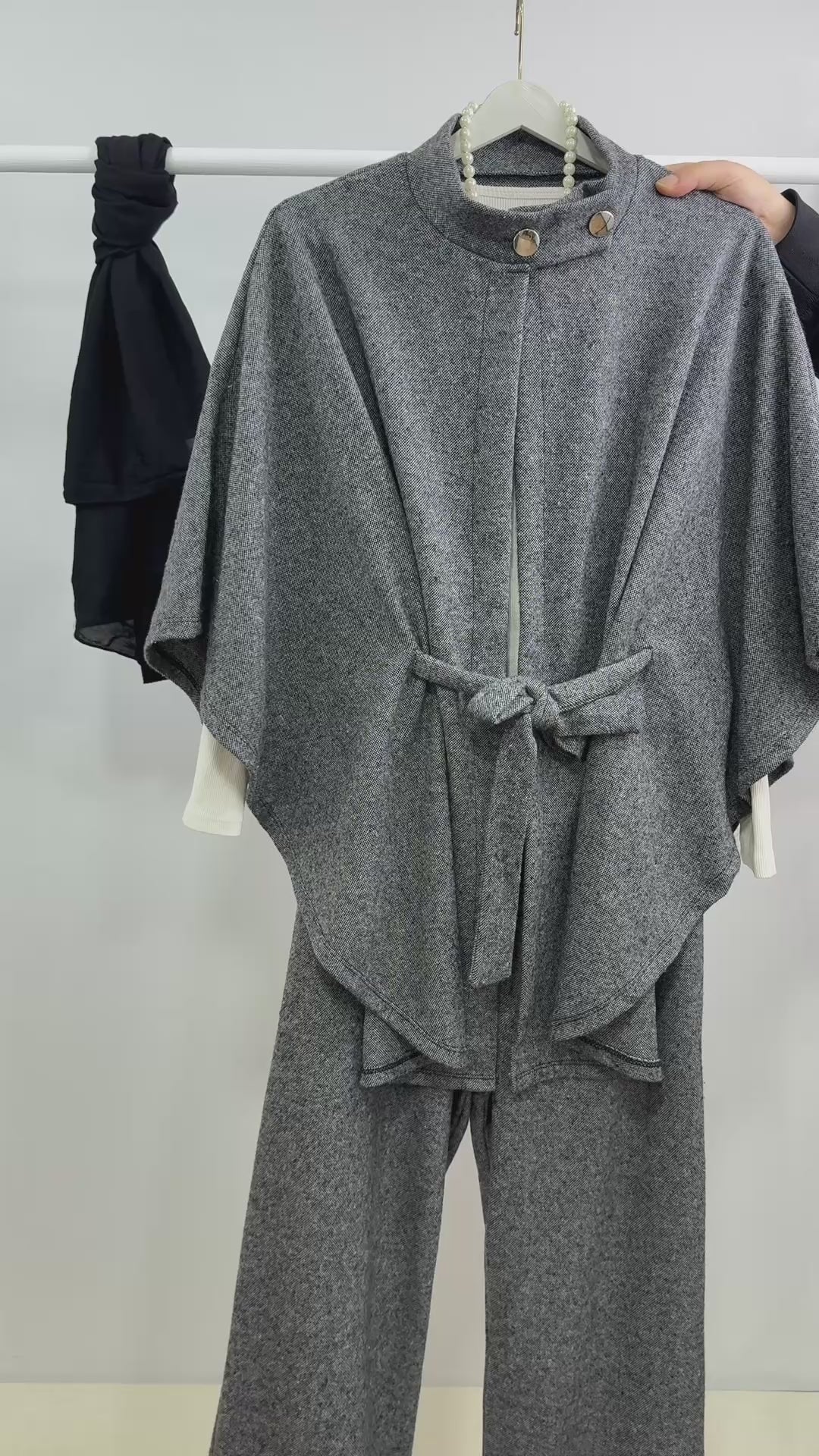 Yünlü kaşe kumaştan üretilen panço takım,sıcak tutan yapısı ve rahat kalıbıyla konforlu şıklık sunar.